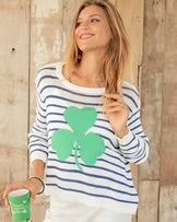Incredibly soft and lightweight, this cotton-blend crew features chic French-inspired stripes, making it a must-have. With a clover leaf graphic knitted directly into the center, this sweater effortlessly combines style and comfort. Thoughtful details include a ribbed neckline, cuffs, and hem with mini side slits, and a relaxed-fit body.