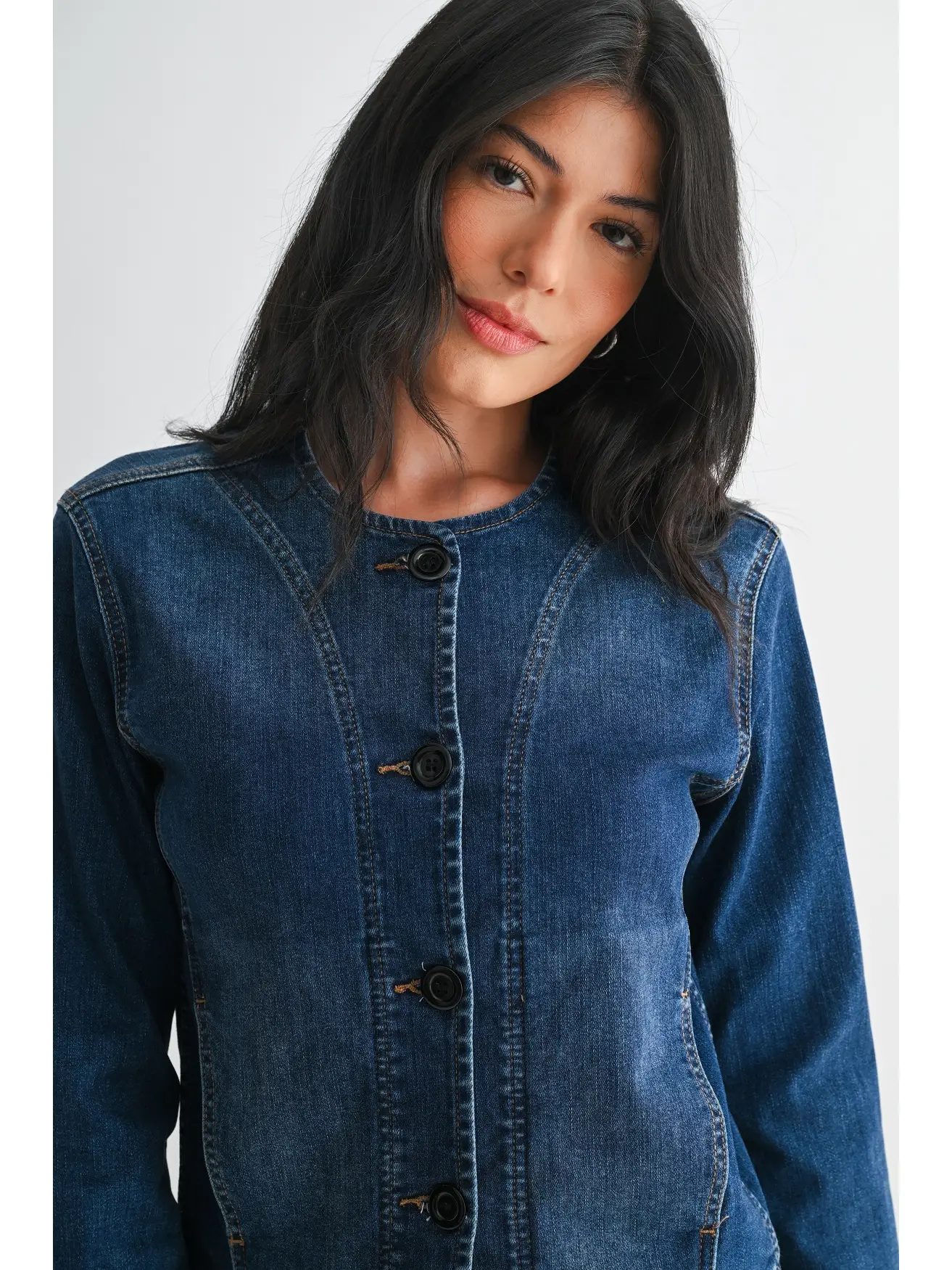Collarless barrel denim jacket with a streamlined silhouette that layers seamlessly with any outfit. Timeless denim quality meets modern design for versatile, everyday wear.