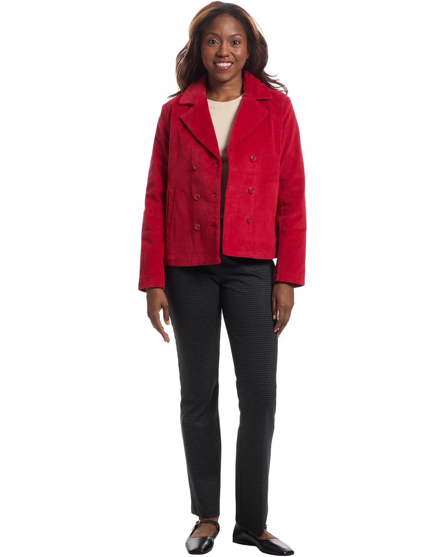 Embrace cozy style with our double breasted corduroy jacket, crafted from soft, textured fabric ideal for autumn. Its tailored, boxy fit offers flattering shape with just enough stretch for comfort. The rich green color brings a natural vibe, while the fully lined interior surprises with a chic white and navy pinstripe cotton. Perfect for layering with your favorite tops and scarves, this jacket keeps you warm and fashionable all season. Made with 98% cotton and easy-care materials, it’s your go-to piece for effortless autumn style.