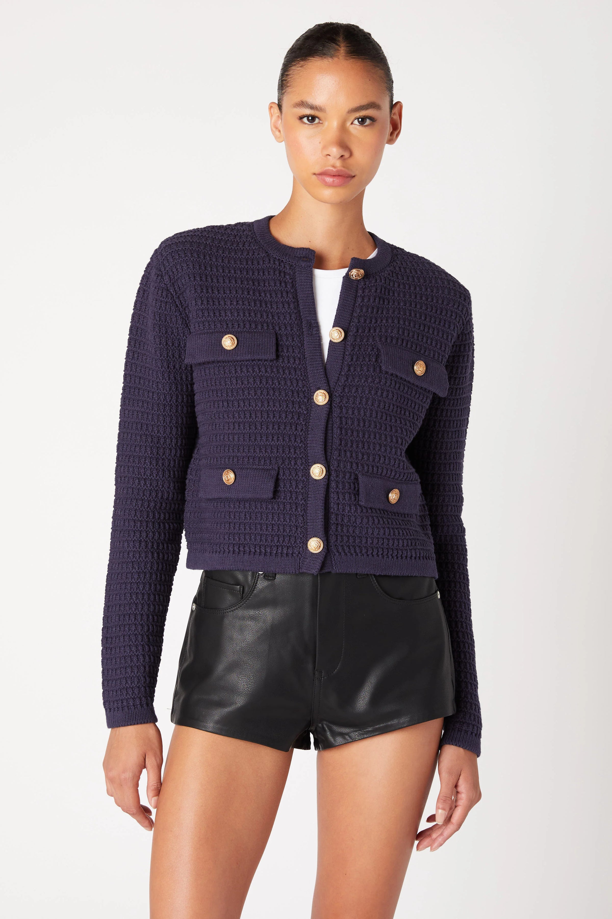 Elevate your layering game with this cropped sweater jacket, designed to transition seamlessly from season to season. Crafted from a breathable cotton-acrylic blend and finished with gleaming gold button accents, it's the perfect piece for adding polish to any outfit. The tailored crop silhouette flatters while maintaining comfort, making it an essential addition to your everyday wardrobe.