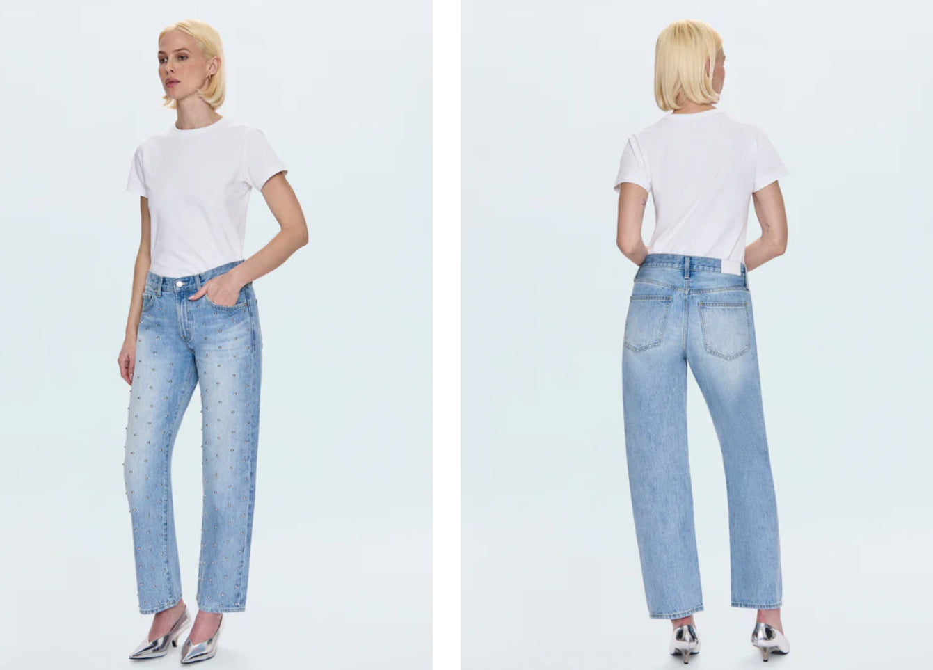 Best selling jean understands proportions. Lexi Jean sits at the perfect mid-rise with our signature bowed straight leg, and a subtle curve at the knee. Crafted from our rigid Denim in Aries, a light wash adorned with a subtle stud detail, feels intentional and never overdone.