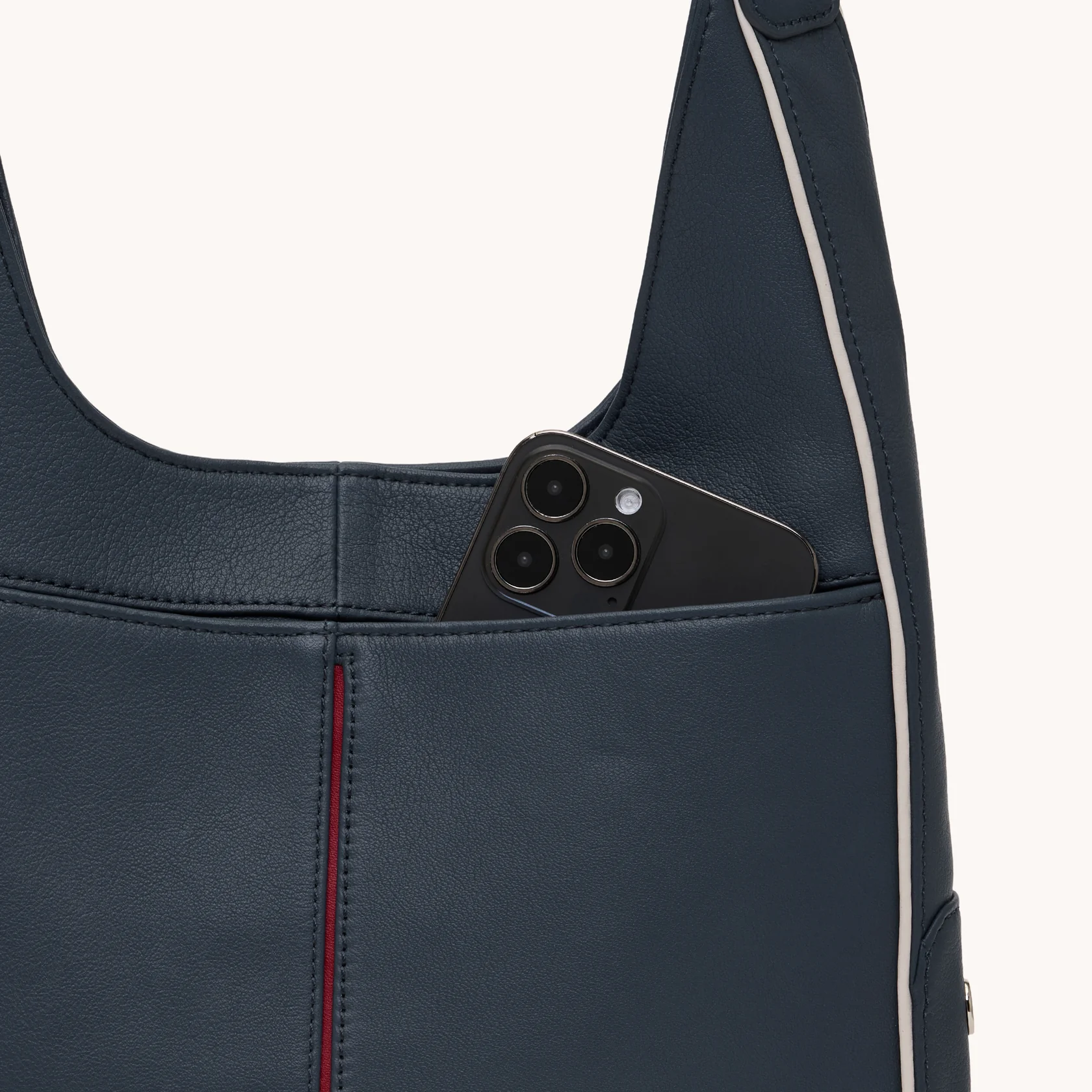 - Crafted with a warm beige pebble leather and Calla Lily White piping details